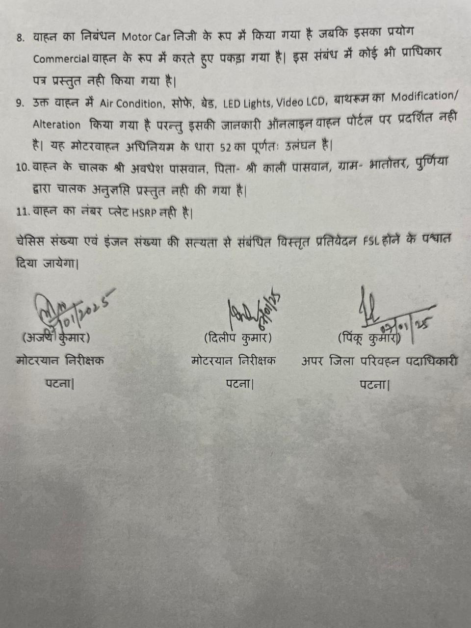 पत्र में एक और बात कही गई है कि वाहन का निबंधन मोटर कार निजी के रूप में किया गया है, जबकि इसका प्रयोग कमर्शियल वाहन के रूप में होते हुए पकड़ा गया है। वाहन में जो एयर कंडीशन, सोफे, बेड और वीडियो एलसीडी लगाया गया है, उसकी जानकारी भी ऑनलाइन पोर्टल पर दर्ज नहीं है।
