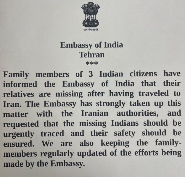 मामले की जानकारी मिलने के बाद भारतीय विदेश मंत्रालय ने ईरान सरकार के साथ मिलकर तीनों को ढूंढने का आश्वसन दिया था। वहीं, ईरानी दूतावास ने सभी भारतीयों को अवैध ट्रैवल एजेंट्स के झांसे में न आने की सलाह दी है।