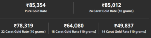 आज भारत में 24 कैरेट सोने की कीमत ₹85,012 प्रति 10 ग्राम, 22 कैरेट के लिए ₹78,319 प्रति 10 ग्राम और 18 कैरेट के लिए ₹64,080 प्रति 10 ग्राम है.