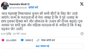 महाराष्ट्र की 288 विधानसभा सीटों के लिए बुधवार (20 नवंबर) को वोटिंग होने वाली है. इससे पहले देश के प्रधानमंत्री नरेंद्र मोदी ने एक्स पर ट्वीट किया है.