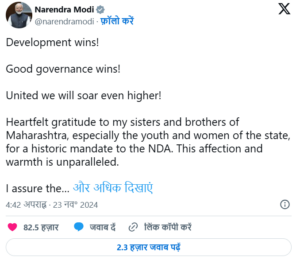 पीएम मोदी ने महाराष्ट्र की जीत को विकास और सुशासन की जीत बताया है। उन्होंने सोशल मीडिया एक्स पर लिखा-एकजुट होकर हम और भी ऊंचे उठेंगे! एनडीए को ऐतिहासिक जनादेश देने के लिए महाराष्ट्र के मेरे भाई-बहनों, खासकर राज्य के युवाओं और महिलाओं का हार्दिक आभार। यह प्यार और गर्मजोशी अद्वितीय है। मैं लोगों को भरोसा दिलाता हूं कि हमारा गठबंधन महाराष्ट्र की प्रगति के लिए काम करता रहेगा।